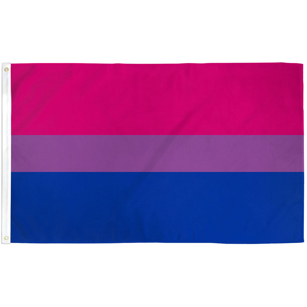 This 3x5ft Bisexual Pride flag features 3 differently colored stripes, Pink for same-sex attraction, Lavender for attraction to both genders, and Blue for opposite-sex attraction.