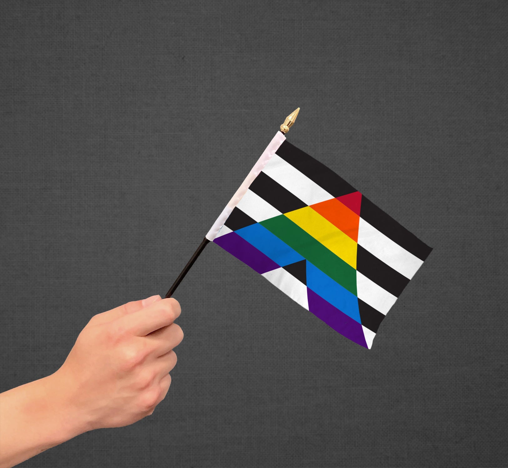 This 4x6in Gay Straight Alliance Pride Flag features a crosshatch of rainbow stripes showing through black and white stripes. Sometimes referred to as the 'Ally' flag, it is meant to represent the heterosexual community extending themselves as an ally for the queer community.