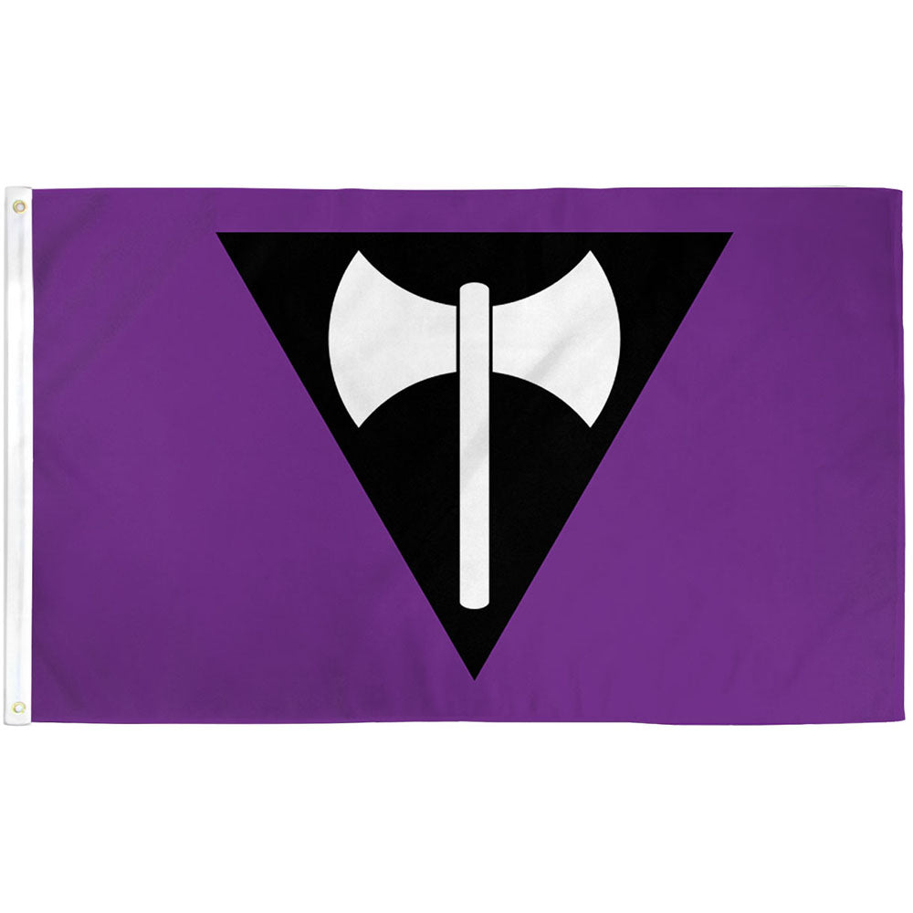 This 3x5ft Lesbian Labrys Pride flag features a white Labrys Ax in a black triangle on a purple background. The Ax emblem was adopted by the lesbian feminist community in the 1970s. This iteration find most of it's popularity with members of the lesbian community who identify as more 'Butch'.