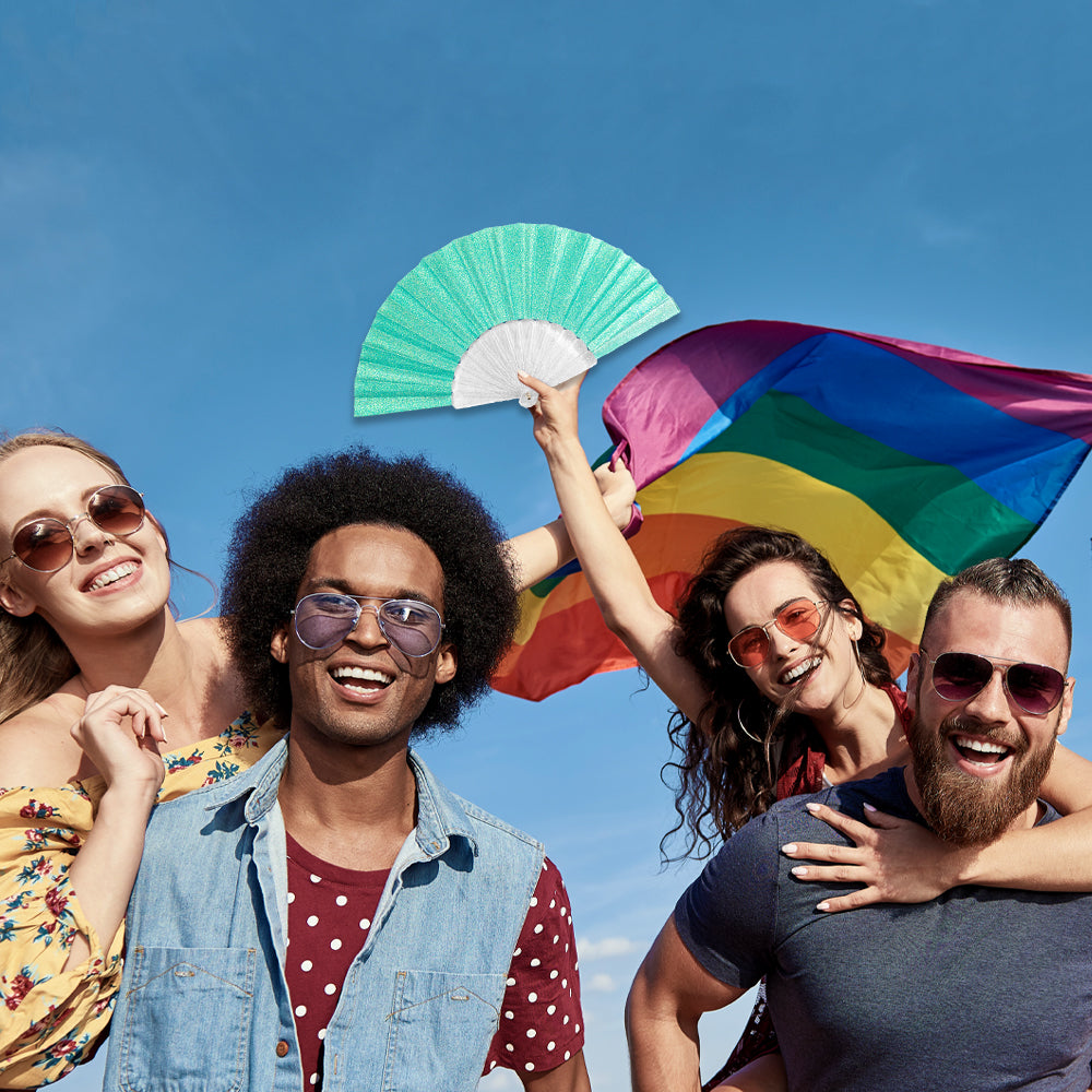 Turn heads and sparkle with pride! Our Mermaid Green Glitter Small Fan (Clear Handle) is the ultimate accessory for festivals, parades, parties, or just living your loudest, proudest life. Measuring 16.5 inches when fully opened with 9 inch arms, this fan brings the drama, shimmer, and snap you deserve.