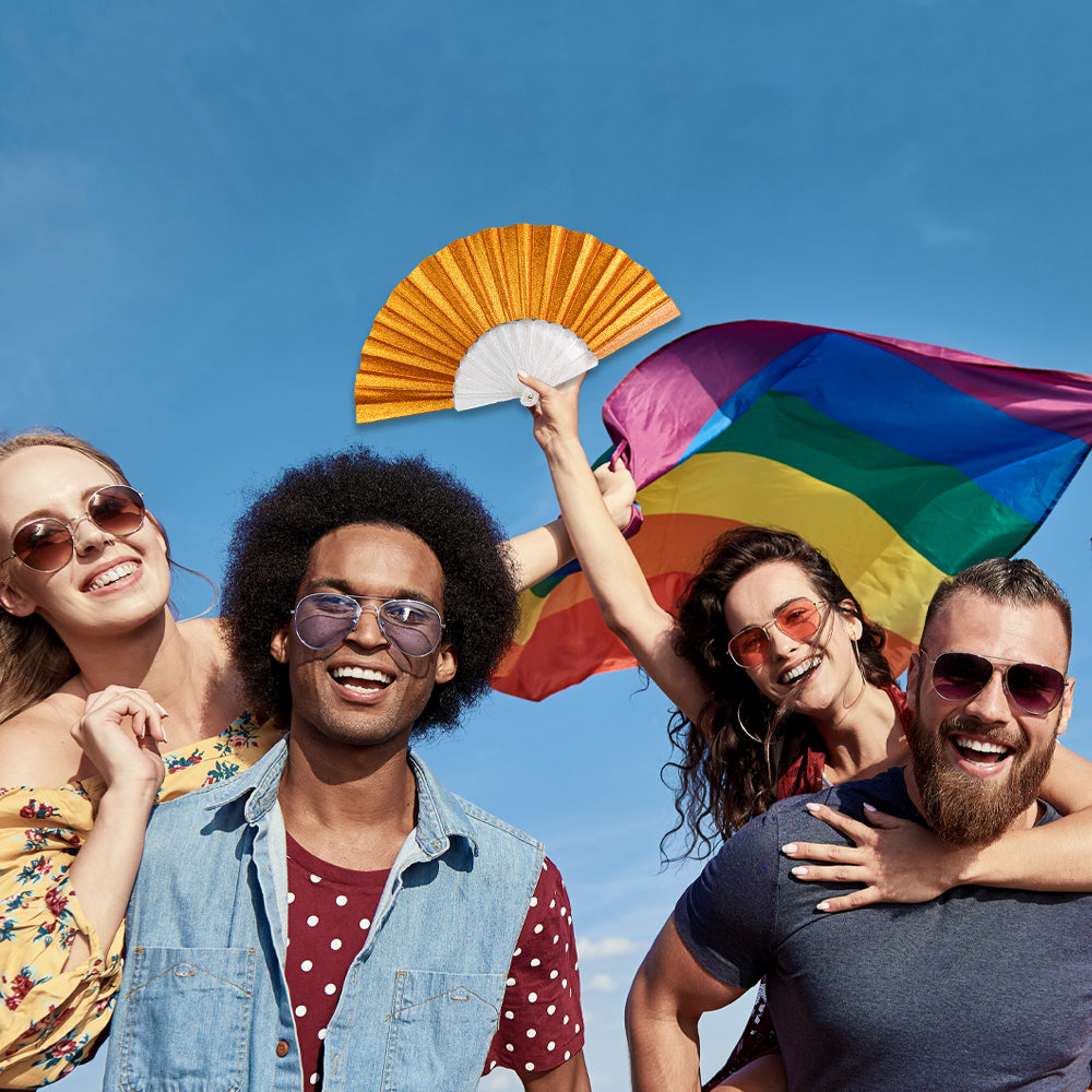 Turn heads and sparkle with pride! Our Orange Glitter Small Fan (Clear Handle) is the ultimate accessory for festivals, parades, parties, or just living your loudest, proudest life. Measuring 16.5 inches when fully opened with 9 inch arms, this fan brings the drama, shimmer, and snap you deserve.