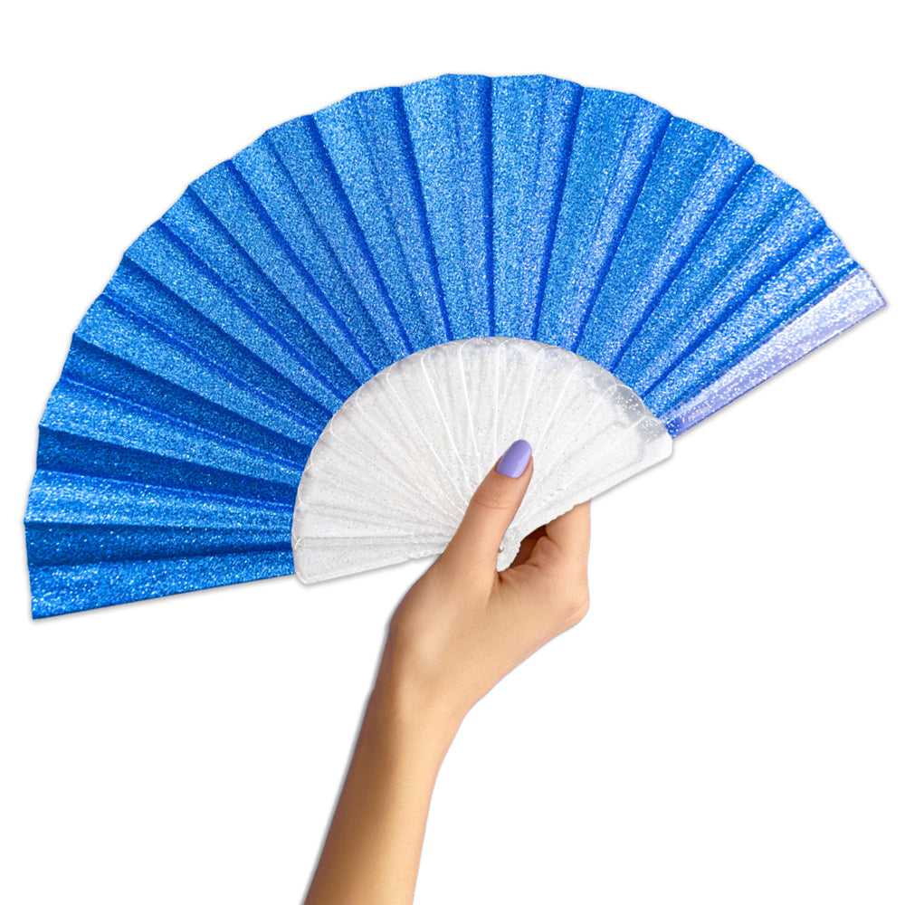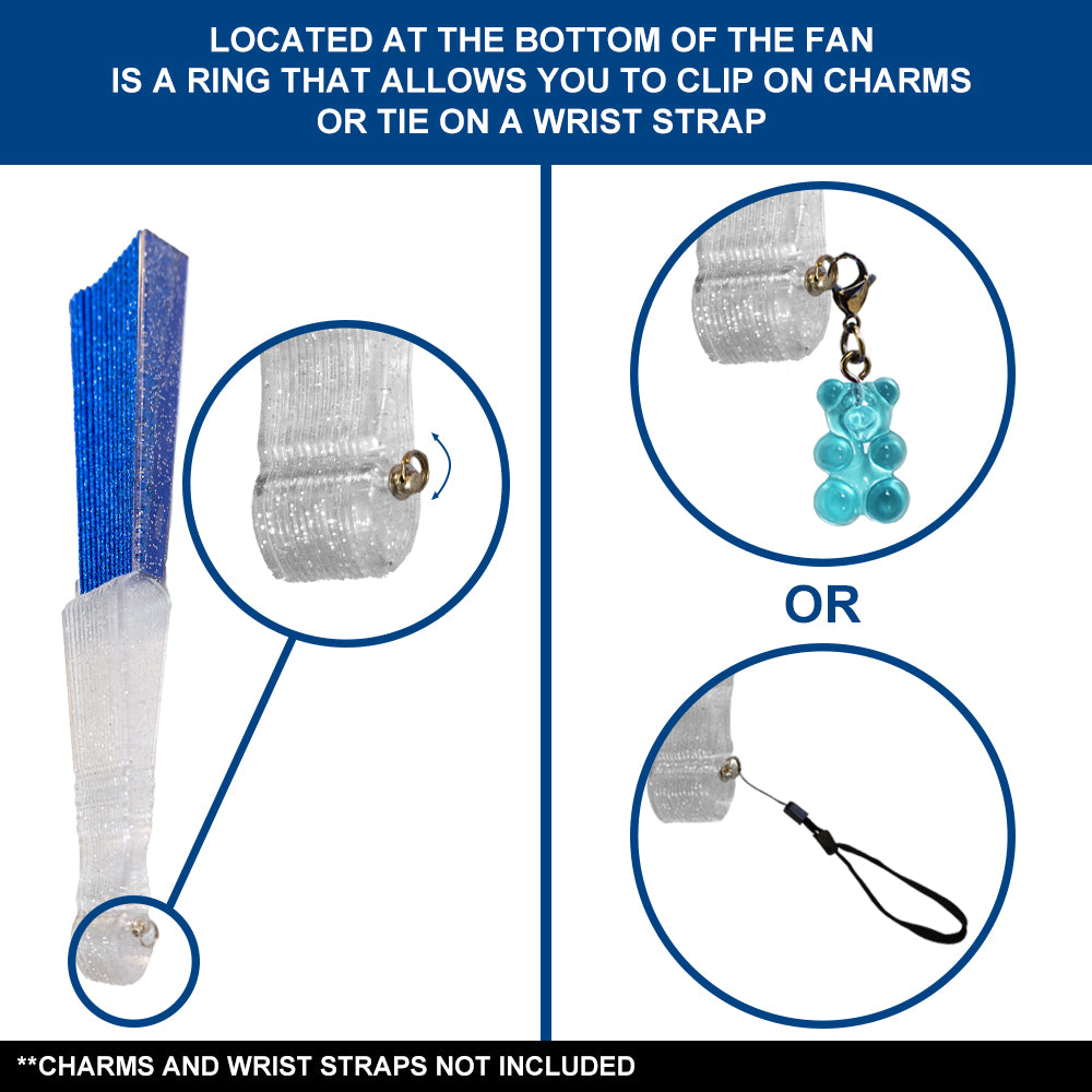 Crafted with vibrant Royal Blue Glitter fabric, it catches the light (and everyone's attention) with every flick. The built-in charm loop lets you personalize your fan with keychains, charms, or ribbons—so you can make it as unique as you are.