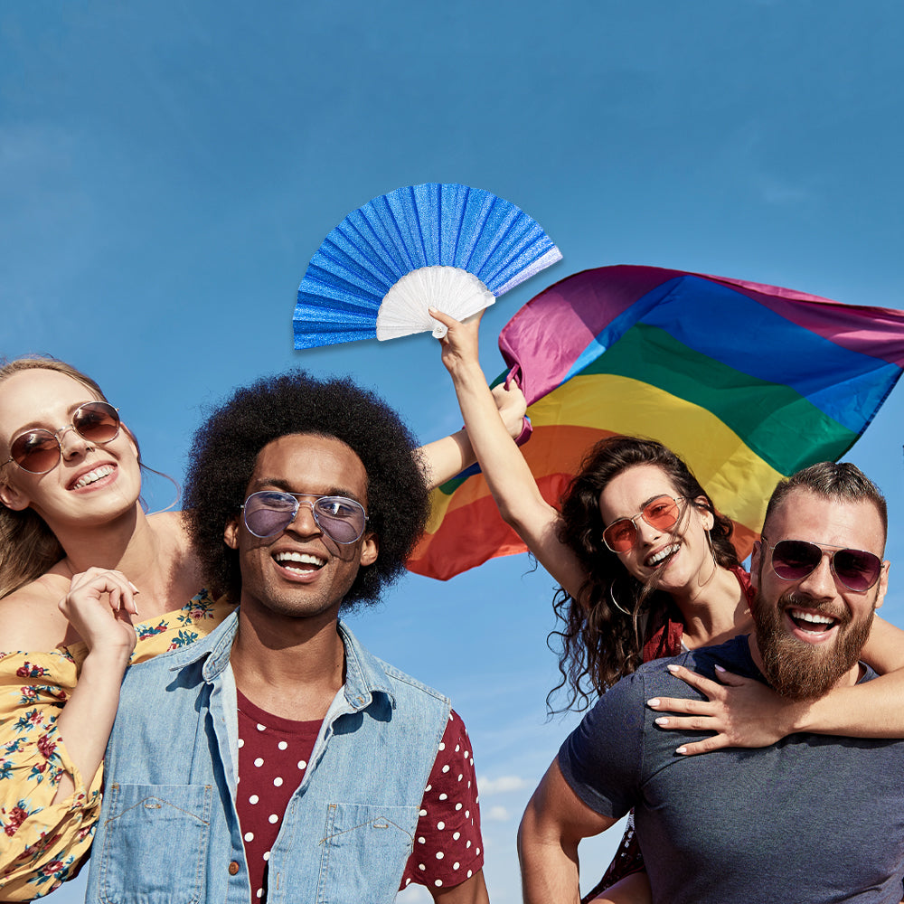 Turn heads and sparkle with pride! Our Royal Blue Glitter Small Fan (Clear Handle) is the ultimate accessory for festivals, parades, parties, or just living your loudest, proudest life. Measuring 16.5 inches when fully opened with 9 inch arms, this fan brings the drama, shimmer, and snap you deserve.
