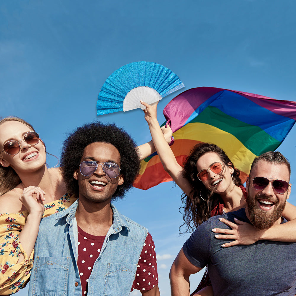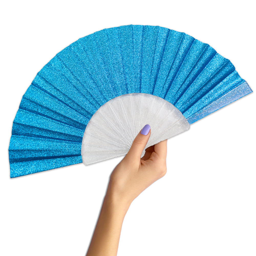 Turn heads and sparkle with pride! Our Sky Blue Glitter Small Fan (Clear Handle) is the ultimate accessory for festivals, parades, parties, or just living your loudest, proudest life. Measuring 16.5 inches when fully opened with 9 inch arms, this fan brings the drama, shimmer, and snap you deserve.
