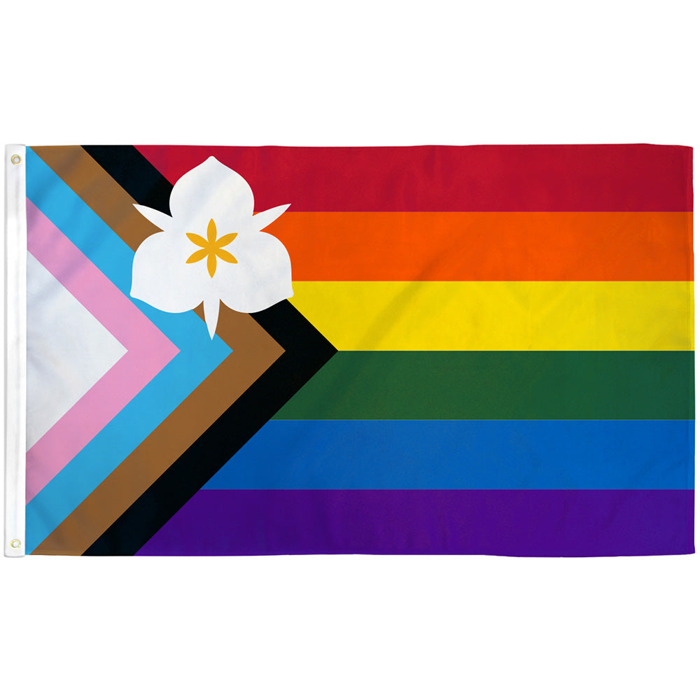 This 3x5ft Progress Pride flag features 6 horizontal stripes and 5 angled stripes, as with the 6-stripe rainbow flag: Red for Life, Orange for Healing, Yellow for Sunlight, Green for Nature, Indigo for Serenity and Violet for Spirit. The inclusive pride flag also features Light Pink, White & Light Blue to represent members of the community who identify as Transgender and Black & Brown stripes to spotlight people of color in the community; the angle of the stripes are meant to show that the community is always looking for progress forward.